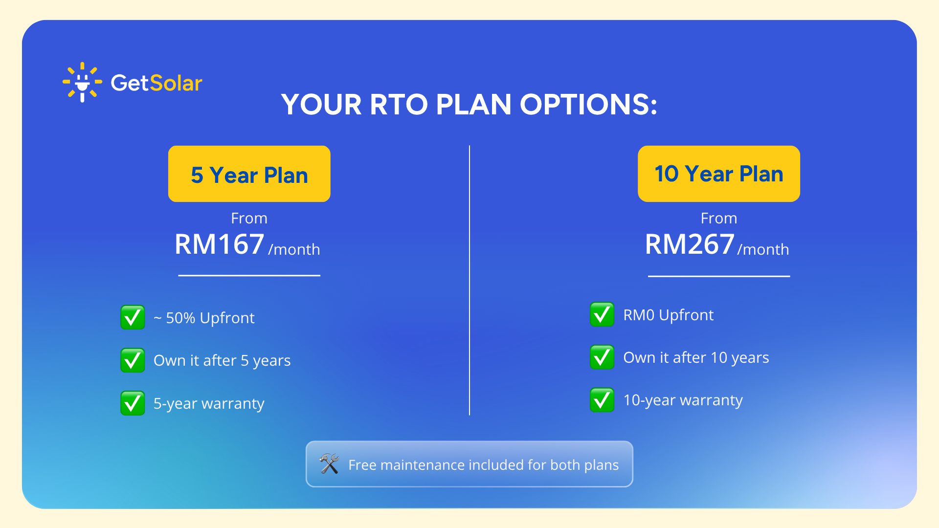 GetSolar's Rent-to-Own (RTO) solar subscription makes solar energy accessible to Malaysians with zero upfront payment and lower monthly fees compared to typical electricity bills. You'll enjoy instant savings, full system ownership at the end of your contract, and complete peace of mind with maintenance and performance guarantees included. It's a smart, affordable, and worry-free way for homeowners to embrace clean energy without the steep initial cost.