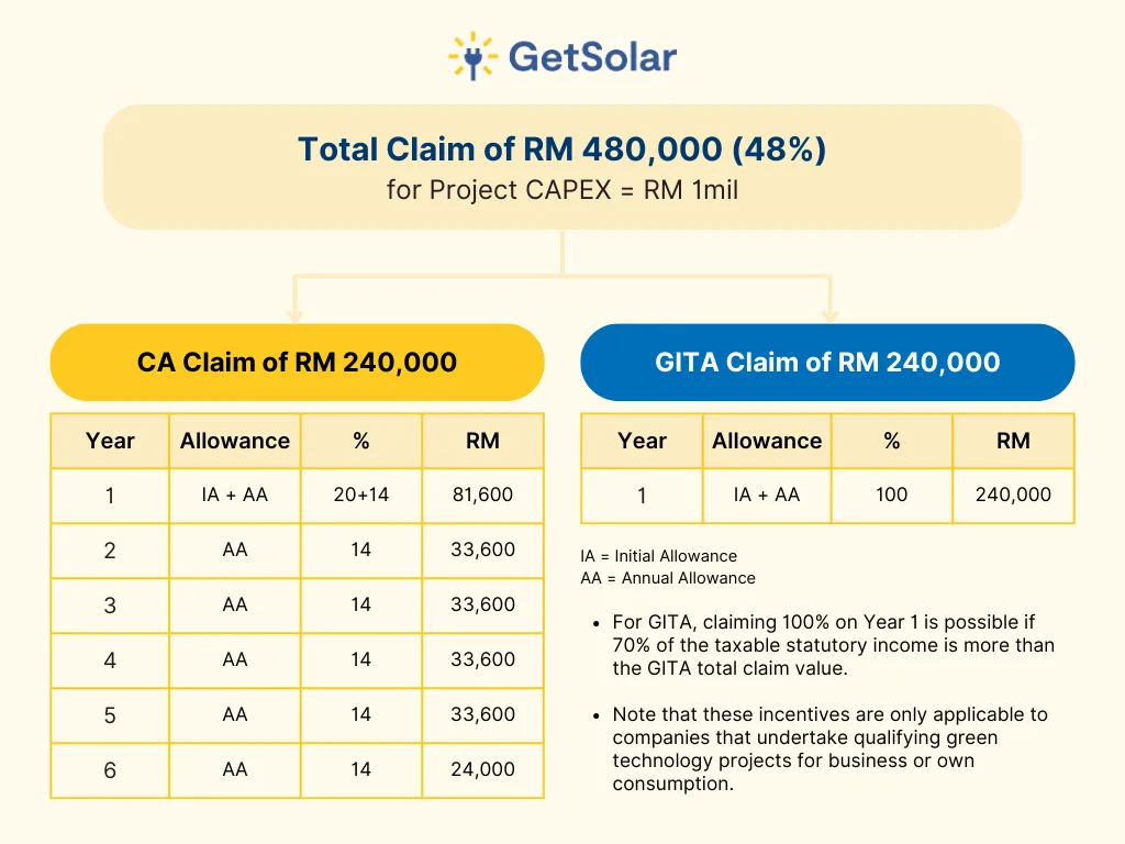 Investing in solar panels presents numerous financial advantages, particularly when businesses take advantage of available tax incentives such as the Green Investment Tax Allowance (GITA) and Capital Allowance (CA). For instance, a company investing RM 1 million in a solar system can claim up to 48% of the project cost, totalling RM 480,000, through GITA and CA. This includes a 100% claim on the first-year expenses under GITA, along with a gradual tax deduction over six years through CA. Such tax savings for solar panels help alleviate the initial investment burden.